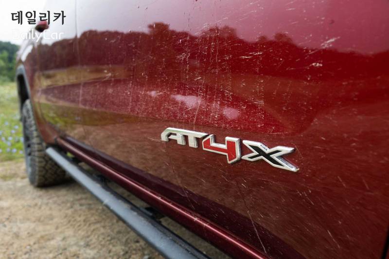 사이드 미러는 블랙 색상으로 커버를 씌웠는데, 투박한 모습이다. AT4X 레터링도 눈에 띈다. 도어 하단에는 스텝게이트를 둬서 승하차시 편의성을 높인다. 휠 하우스는 압도하는 분위기다. 18인치 블랙 휠이 적용된 타이어는 265mm 사이즈다. 픽업트럭으로서 적재함은 총 653kg의 짐을 실을 수 있다.