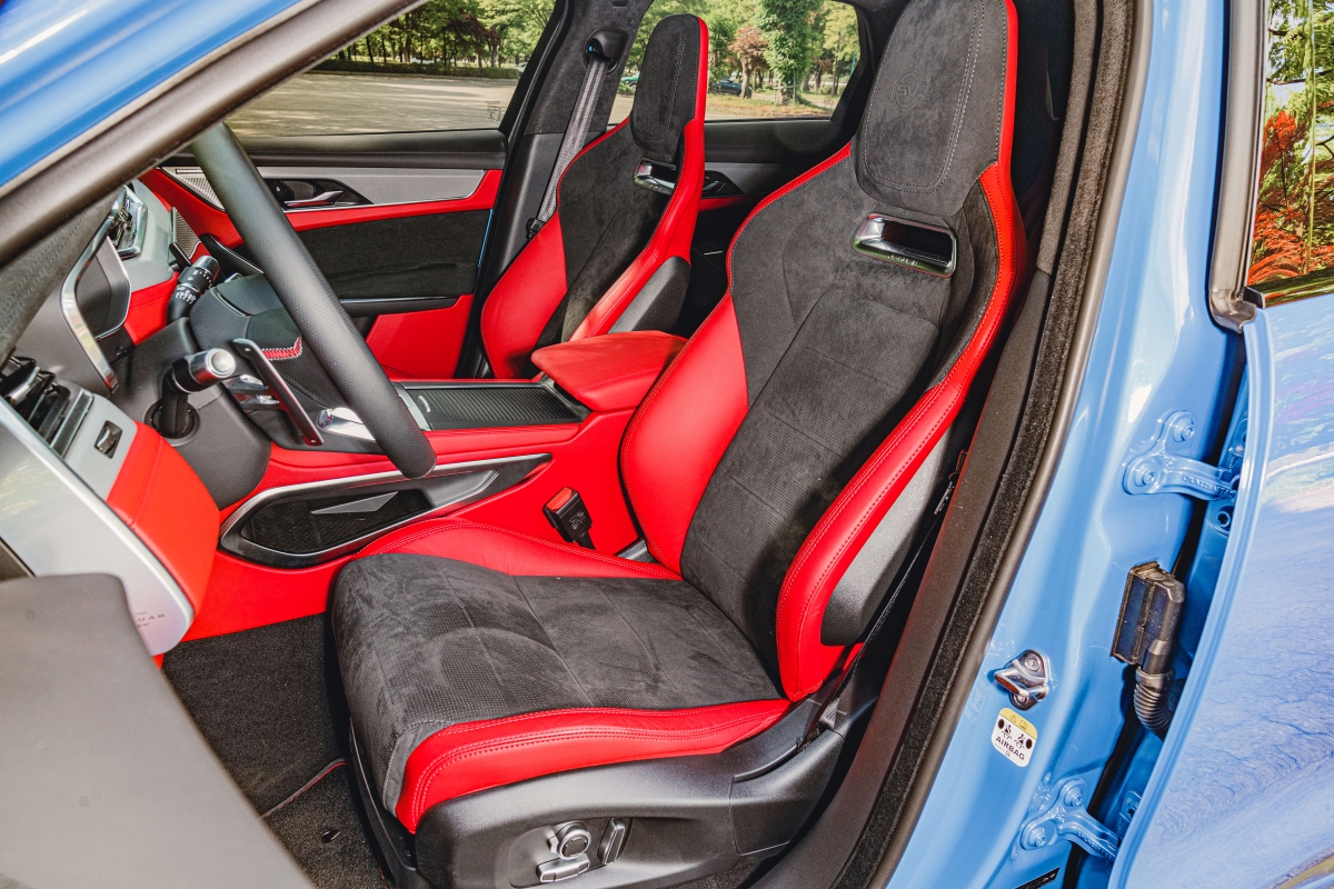 외관보다 더 많은 변화를 거친 것은 인테리어다. 시트는 버킷 타입으로 고성능 자동차에 딱 알맞은 물건이다. 조금 딱딱한 느낌이 들지만 몸이 잘 미끄러지지 않아서 마음에 든다. 스티어링 휠의 디자인은 최근 만났던 자동차 중에 가장 멋있다. 특히 손으로 느껴지는 촉감이 무척 고급스럽다. 촉감 이야기가 나온 김에 이야기하자면 실내를 감싸고 있는 가죽들의 품질도 무척 좋다. 손으로 쓰다듬어 보면 특유의 부드러운 감촉이 마치 명품 가방을 생각나도록 만든다. 전자식 기어 레버는 뭉툭한 주먹처럼 생겼고, 기어 레버를 중심으로 좌우에는 시동 버튼과 드라이브 모드 셀렉터가 있다. 드라이브 모드 셀렉터는 누르면 튀어 올라오는 다이얼 방식이다. 다만 다이얼을 돌린 후 소프트웨어가 반응하는 속도가 느려서 아쉽다.