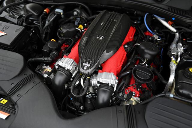 콰트로포르테 트로페오의 보닛 아래에는 그 동안 ‘푸른색의 마크’를 품었던 엔진들과는 다른 붉은 DNA의 V8 엔진이 자리한다.