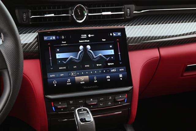 오늘의 주인공은 붉은색 실내로 ‘강렬함’을 언급한다. 고성능 모델을 강조하는 스티치와 카본파이버 패널이 곳곳에 자리해 화려하게 피어났다. 여기에 더불어 마세라티 특유의 큼직한 스티어링 휠이 기대감을 더한다.
