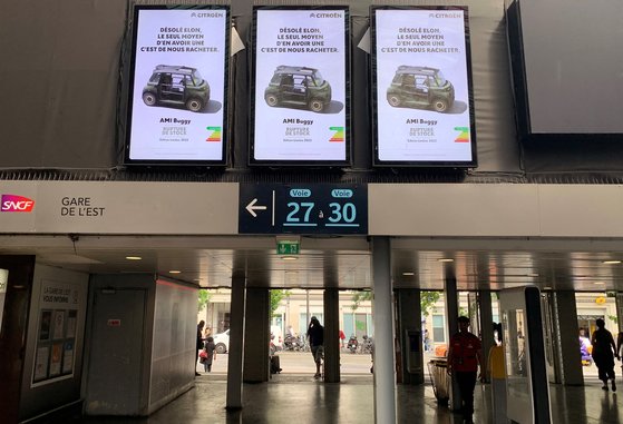 지난 6월 프랑스 파리에 걸린 시트로엥 전기차 애이미 광고판. 일론 머스크 테슬라 CEO를 향해 "미안하지만 일론, 우리 차 한 대 사려면 인수해야 한다"는 도발 문구가 프랑스어로 담겼다. 로이터=연합뉴스
