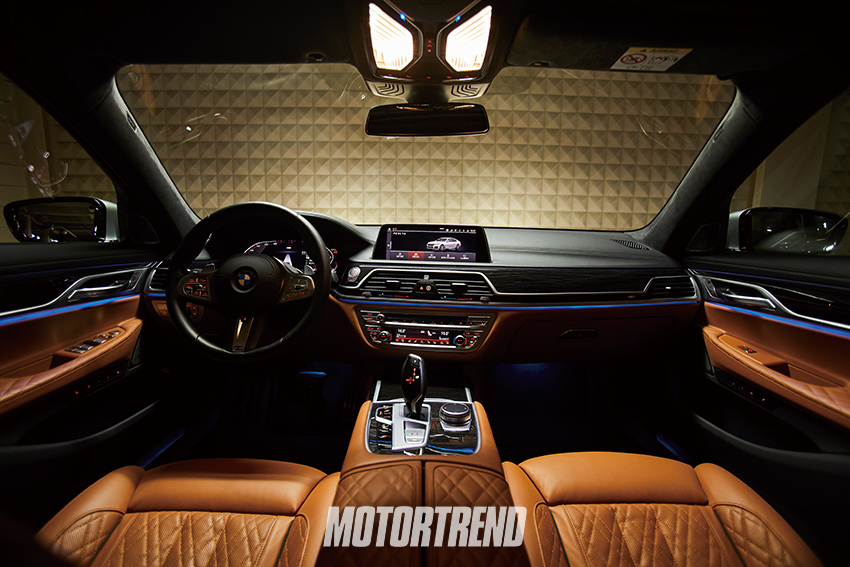 740Li의 실내는 확실히 복잡하다. 이전의 실내 디자인 안에 최대한 많은 신기술과 고급스러움을 담아낸 결과라 할 수 있다. 버튼과 다이얼, 화면들이 대시보드와 센터콘솔에 많이, 그리고 분산되어 배치됐다. 톤 다운된 알루미늄 스트라이프 장식과 블랙 하이글로시 등도 많이 사용해 고급스럽기는 하지만 조금 복잡한 실내 분위기를 만드는 원인이 됐다.