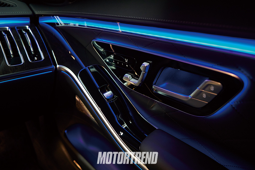 이에 비해 메르세데스-벤츠 S 580 L의 운전석은 확실히 미래적이다. 7시리즈가 기존의 디자인 안에 담기 바빴던 새로운 기능들을 S-클래스는 실내를 새로 디자인하면서 완전히 새롭게 배치했음을 단정하고 새로운 실내 디자인에서 쉽게 느낄 수 있다. 디스플레이나 스위치들을 더하거나 붙인 것이 아니라 원래 그곳이 자기 자리인 듯 깔끔하게 실내 디자인에 녹아들어 있다. 그 중심에는 MBUX로 정리된 대형 디스플레이가 있다. 덕분에 실내는 깔끔하고 시원하다.