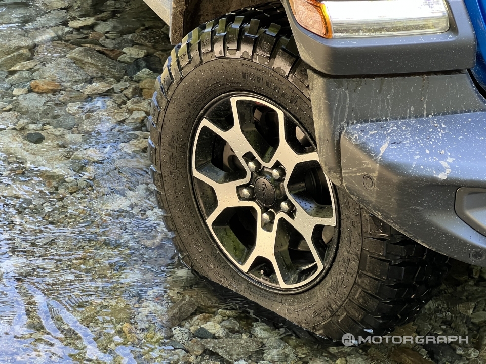 트랜스퍼 케이스 레버를 조작해 사륜구동을 체결했다. 평소에는 뒷바퀴만 굴리다가 험로를 만나면 네 바퀴를 동시에 사용한다. 커다란 오프로드 타이어로 거침없이 돌부리를 넘는다. 높은 지상고 덕에 장애물이 차에 닿을 염려도 적다.