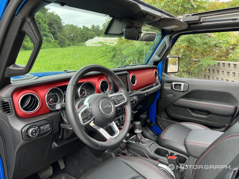 대시보드를 가죽으로 마감한 오버랜드와 달리, 루비콘은 레드 컬러 알루미늄을 사용했다. 극한 상황에서 진흙이나 수분 등 오염 물질에 유리한 구성이다. 시각적 만족도도 높다. 거뭇한 가죽보다는 레드 컬러 금속이 랭글러의 이미지와 더 어울린다. 센터페시아 아래는 오버랜드에서 볼 수 없는 액슬락 기능과 전방 스웨이바 분리 조작부가 더해진다.