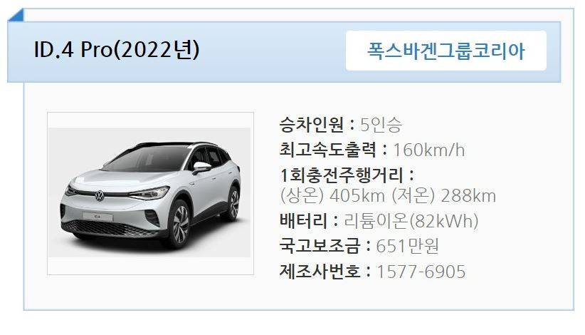 시판가격은 ID.4 프로 가격은 미국 4만3675달러(약 5,700만원)부터 시작한다. 국내에서는 아직 판매가격이 공개되지 않았지만, 환경부에 따르면 폭스바겐 ID.4 프로 모델은 국고보조금이 651만원으로 책정됐다.