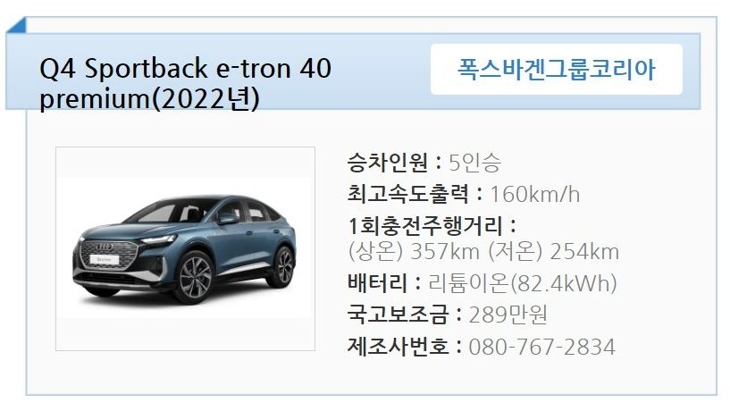 아우디 Q4 e-트론의 판매가격은 공개되지 않았지만, 최근 환경부 무공해차 통합 누리집에 업데이트 된 내용에 따르면, Q4 e-트론 스포트백은 국고보조금이 289만원으로 확정됐다.
