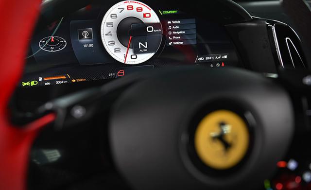 운전석과 조수석을 명확히 구성이나 디지털 디스플레이 패널의 전면 배치, 그리고 터치 인터페이스를 더한 스티어링 휠 등은 ‘페라리의 미래’를 기대하게 만든다.