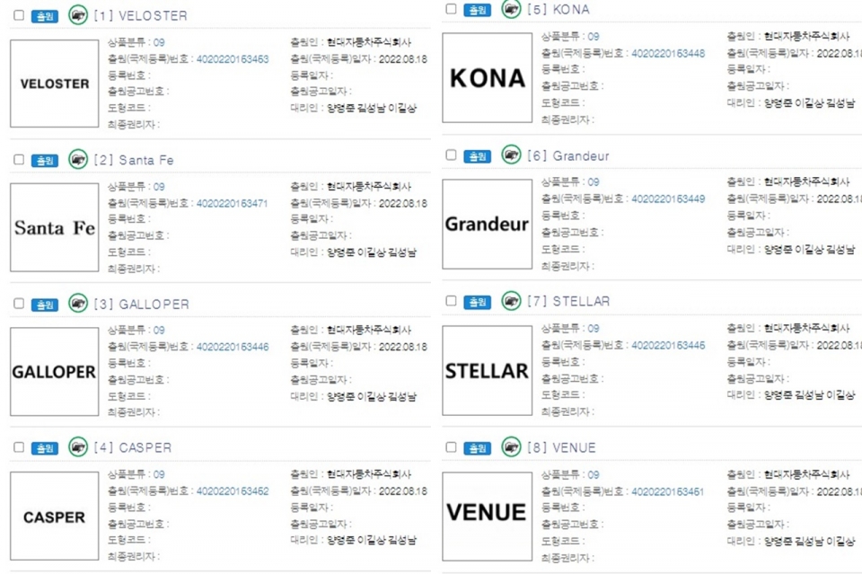 7일 관련 업계에 따르면 현대차는 지난달 갤로퍼, 스텔라를 포함한 시판 중인 일부 모델의 신규 상표권 등록을 출원했다. 동일 날짜에 올라온 현대차 신규 상표권 목록에는 벨로스터, 싼타페, 갤로퍼, 캐스퍼, 코나, 그랜저, 스텔라, 베뉴, 투싼 등이 포함되고 이들 모두는 영문명으로 출원됐다.