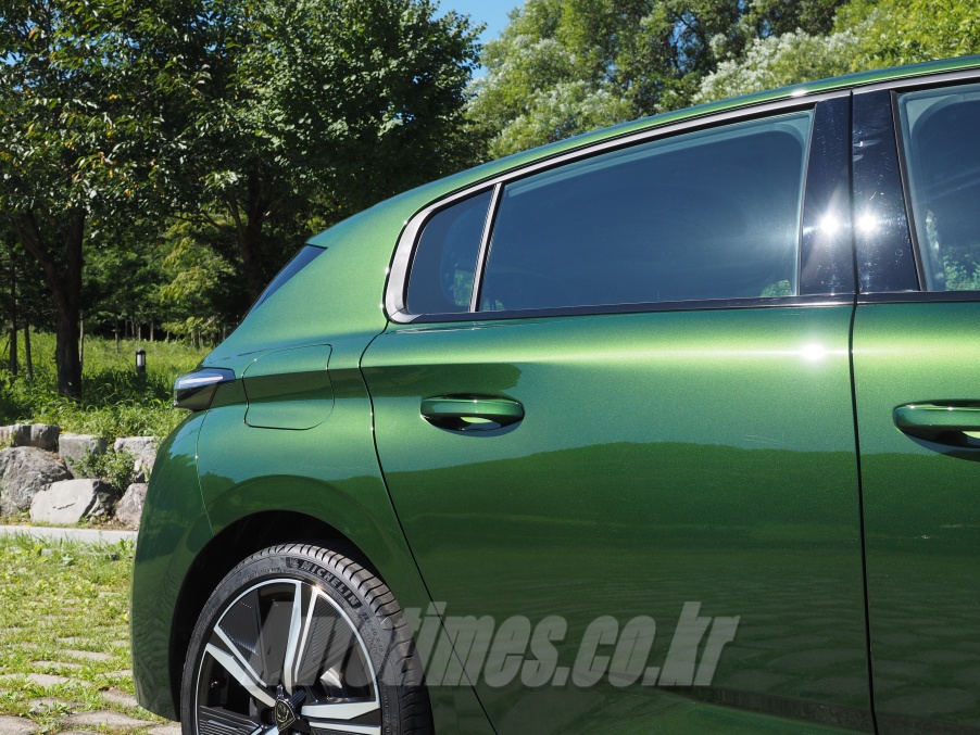 펜더에 붙은 푸조 로고를 비롯해 세련된 디자인의 사이드미러, 두툼한 윈도우 몰딩도 전부 블랙으로 꾸며 멋을 냈다. 낮은 루프 라인은 공기 저항과 소음을 저감시켜 공기저항계수가 0.28Cd에 불과하다.