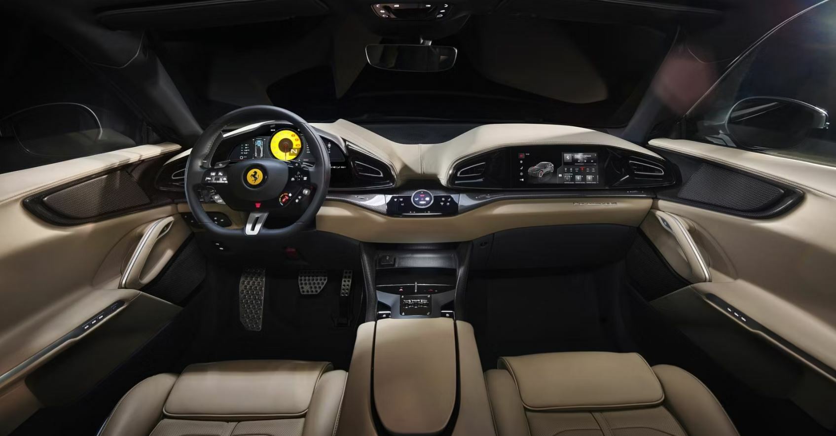 페라리 역사상 4개의 문이 달린 최초의 모델 푸로산게 SUV의 인테리어는 외관만큼이나 매적이고 실용적인 기능으로 가득 차 있다.