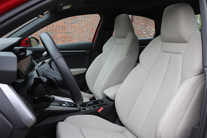 시트는 5인승. 차체에 비해 1열 시트의 공간이 의외로 넓다. 이것도 달라진 독일 차들의 특징이다. 1열 시트는 풀 버킷 타입으로 스포티한 감각을 살리고 있다. 헤드레스트가 시트와 연결된 것도 거기에 기여한다. 리어 시트는 60 : 40분할 접이식, 시트백이 약간 높다는 느낌이다. 1열 시트와 마찬가지로 공간은 좁다는 생각은 들지 않는다. 가운데 헤드레스트는 앞좌석 룸 미러에서 후방 시야를 약간 가린다. 앞바퀴 굴림 방식 모델인데도 가운데 터널이 약간 솟아있다. 차체 강성을 위한 것이다.