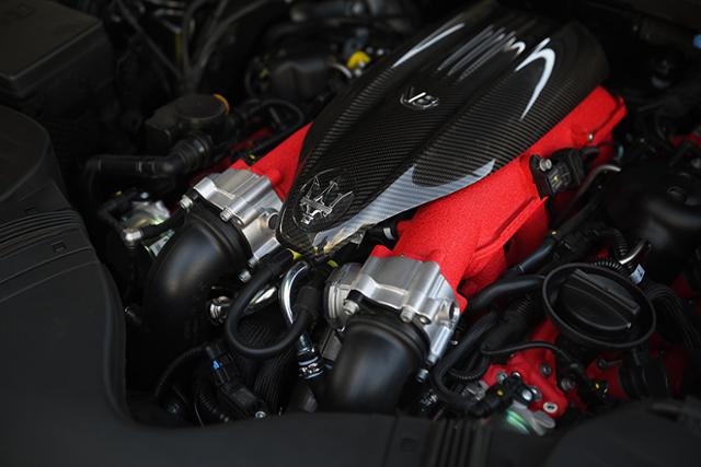 기블리 트로페오의 보닛 아래에는 ‘페라리의 붉은색’이 돋보이는 V8 엔진이 자리한다.