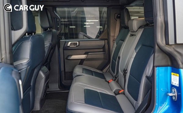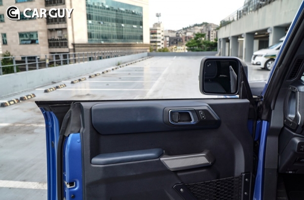 브롱코 인기 비결의 주인공은 1세대 디자인을 오마주한 외관 디자인이다. 네모난 차체, 동그란 헤드램프, 포드 로고 대신 새겨 넣은 브롱코 레터링과 차체 곳곳에 숨어있는 디테일까지 정통 오프로더 시장을 주름잡고 있는 지프 랭글러와 견줘도 부족함이 없다. 높은 지상고와 두툼한 트레드를 자랑하는 A/T 타이어, 후면에 달린 스페어 타이어까지 누가 봐도 오프로드를 달리기 위해 만들어졌다는 것을 알 수 있다. 큼직한 디자인 요소 외에 곳곳에 숨어있는 디테일을 찾는 것도 또 다른 묘미다. 대표적으로 후드 양 끝 단에 붙어있는 손잡이다. 루프레일을 활용해 카약과 같은 긴 짐을 루프에 얹고 고정을 하기 위한 용도다. 캠핑을 갔을 때 텐트나 타프의 스트링을 묶기에도 안성맞춤이다. 주유구를 열면, 브롱코를 상징하는 각 세대의 모델을 각인해 놓은 점도 재밌는 요소다. 사이드미러에 위치한 서치 라이트, 프레임리스 도어도 입가에 미소를 번지게 하는 구성 중 하나다.