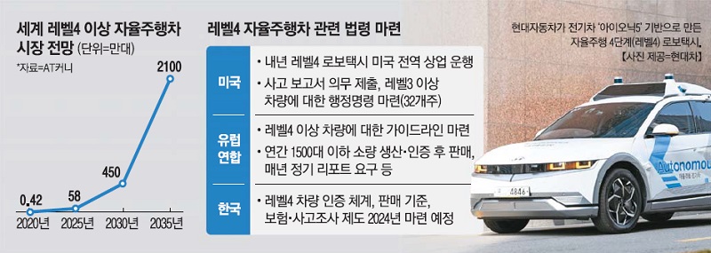 운전자가 탑승해도 주행에 거의 개입하지 않는 자율주행 4단계(레벨4) 기술이 이미 국내에 마련됐지만 한국은 관련 제도가 미비해 다른 나라보다 실제 도입은 늦어질 전망이다. 해당 차량에 대한 인증 체계와 판매 기준, 보험·사고조사 제도까지 함께 규정한 법령이나 가이드라인 마련이 시급하다.