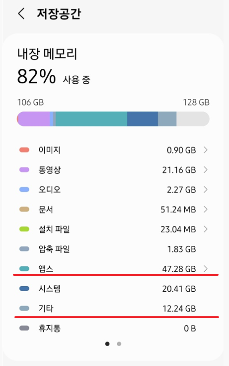 다시 저장공간을 확인합니다. 아까와 달리 앱스에 사용 중인 공간이 표시되고 기타는 용량이 줄어든 것을 확인할 수 있습니다.