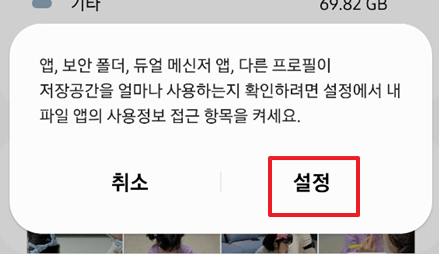 "앱, 보안 폴더, 듀얼 메신저 앱, 다른 프로필이 저장공간을 얼마나 사용하는지 확인하려면 설정에서 내 파일 앱의 사용정보 접근 항목을 켜세요."라는 팝업창이 뜨면 설정을 선택합니다.