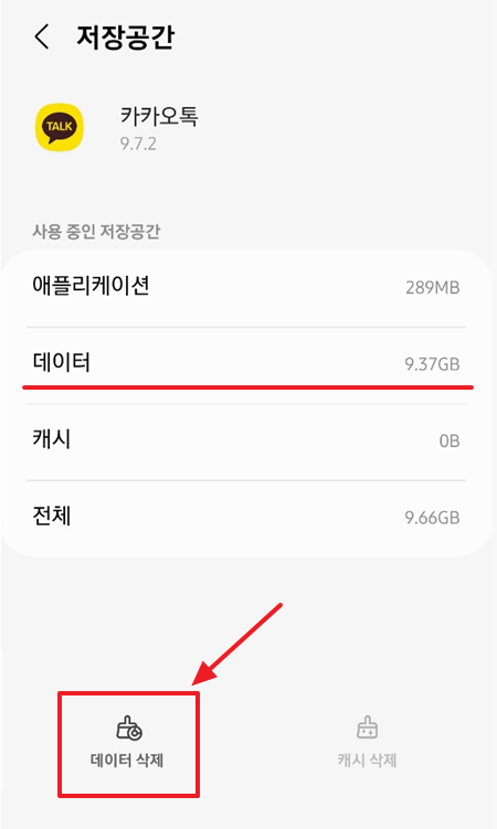 데이터를 삭제해 봅시다. 카카오톡 데이터가 9.37GB나 차지하고 있는 게 보입니다. 하단의 데이터 삭제 아이콘을 선택합니다.