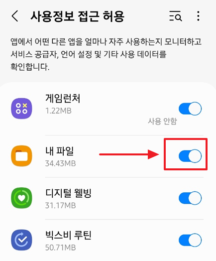 사용정보 접근 허용 창으로 넘어갑니다. 내 파일 옆 버튼을 눌러 활성화 시켜줍니다. 지금은 회색으로 비활성화되어 있을 것입니다.