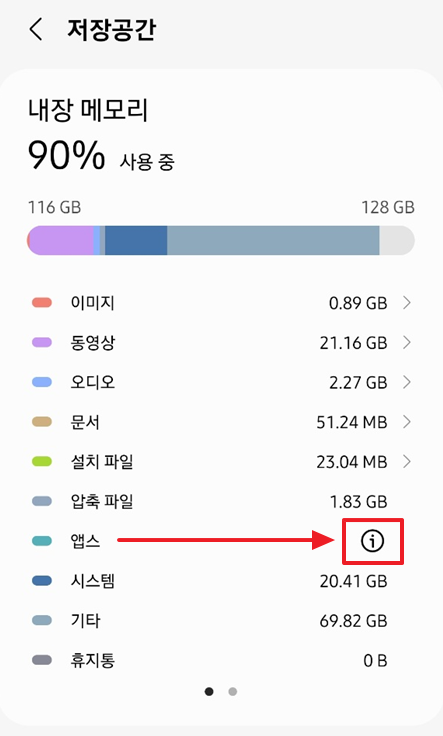 저장공간에서 앱스 옆에 사용중인 용량이 나와있는 게 아니라 ⓘ아이콘이 떠 있는 것을 볼 수 있습니다. ⓘ를 눌러줍니다.