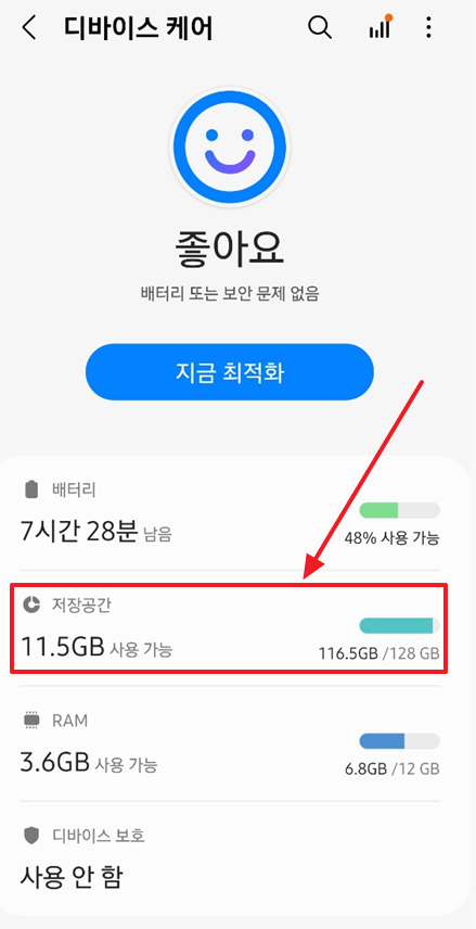 디바이스 케어 메뉴 중 저장공간을 선택합니다.