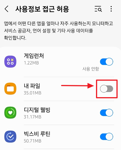 사용정보 접근 허용 창으로 넘어갑니다. 내 파일 옆 버튼을 눌러 활성화 시켜줍니다. 지금은 회색으로 비활성화되어 있을 것입니다.
