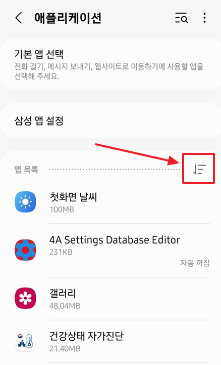 애플리케이션 화면으로 들어가게 되면 앱 목록 옆의 정렬 아이콘을 선택합니다.