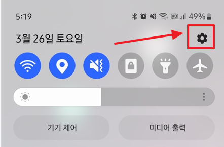 갤럭시를 사용하고 있다면, 어떤 파일이 내 휴대폰의 저장공간을 차지하고 있는지 확인할 수 있습니다. 우선 상단바를 내려 설정 아이콘을 선택합니다.
