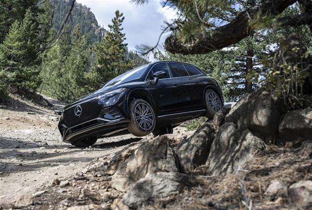 한쪽 바퀴가 들릴 정도로 거친 로키산맥의 오프로드 지형을 통과하고 있는 벤츠의 대형 순수전기 SUV ‘EQS SUV 580 4MATIC’. 메르세데스벤츠 제공