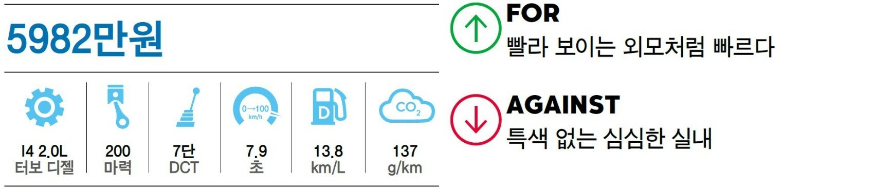 이전보다 10마력 강력한 200마력 최고출력을 내는 2.0L 디젤 엔진. 시속 100km까지 가속 시간은 7.9초, 최고속도는 시속 237km다