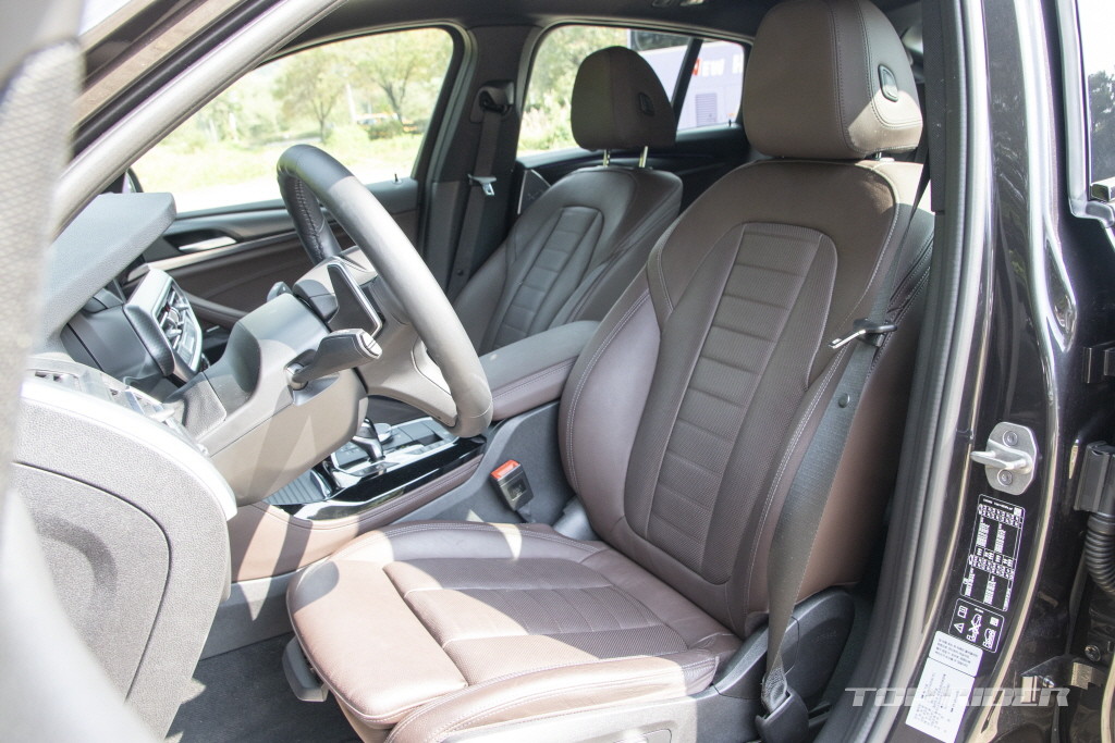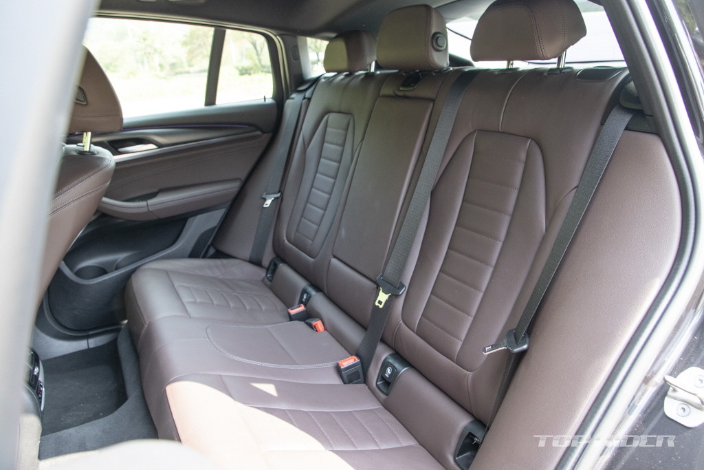 뉴 X4 xDrive20i M 스포츠의 운전석 시트 포지션은 상당히 낮다. 국산차 기준 최저 지상고가 낮은 소형 크로스오버와 유사한 수준이다. 버네스카 가죽으로 마감된 시트는 촉감이 부드럽고 착좌감도 좋다. 헤드레스트는 단단하다. 2열 레그룸 및 헤드룸 공간은 의외로 넓다.