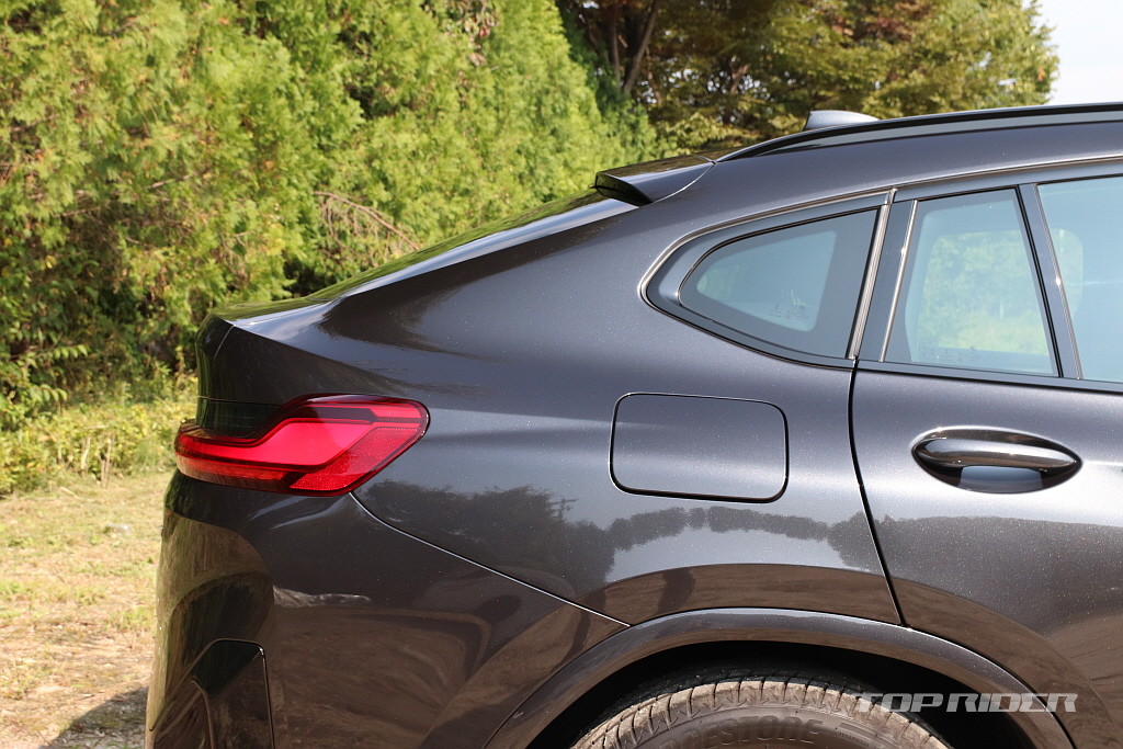 범퍼 하단 3분할된 에어 인테이크로 BMW 특유의 세련된 디테일이 구현됐다. 매끄럽게 떨어지는 쿠페형 루프라인을 갖춘 측면부는 X4의 강점이다. 쭉 뻗은 보닛과 짧은 트렁크 리드도 특징이다. 후면부에는 3D 테일램프와 사각 형태의 머플러, 범퍼 디퓨저가 탑재됐다.