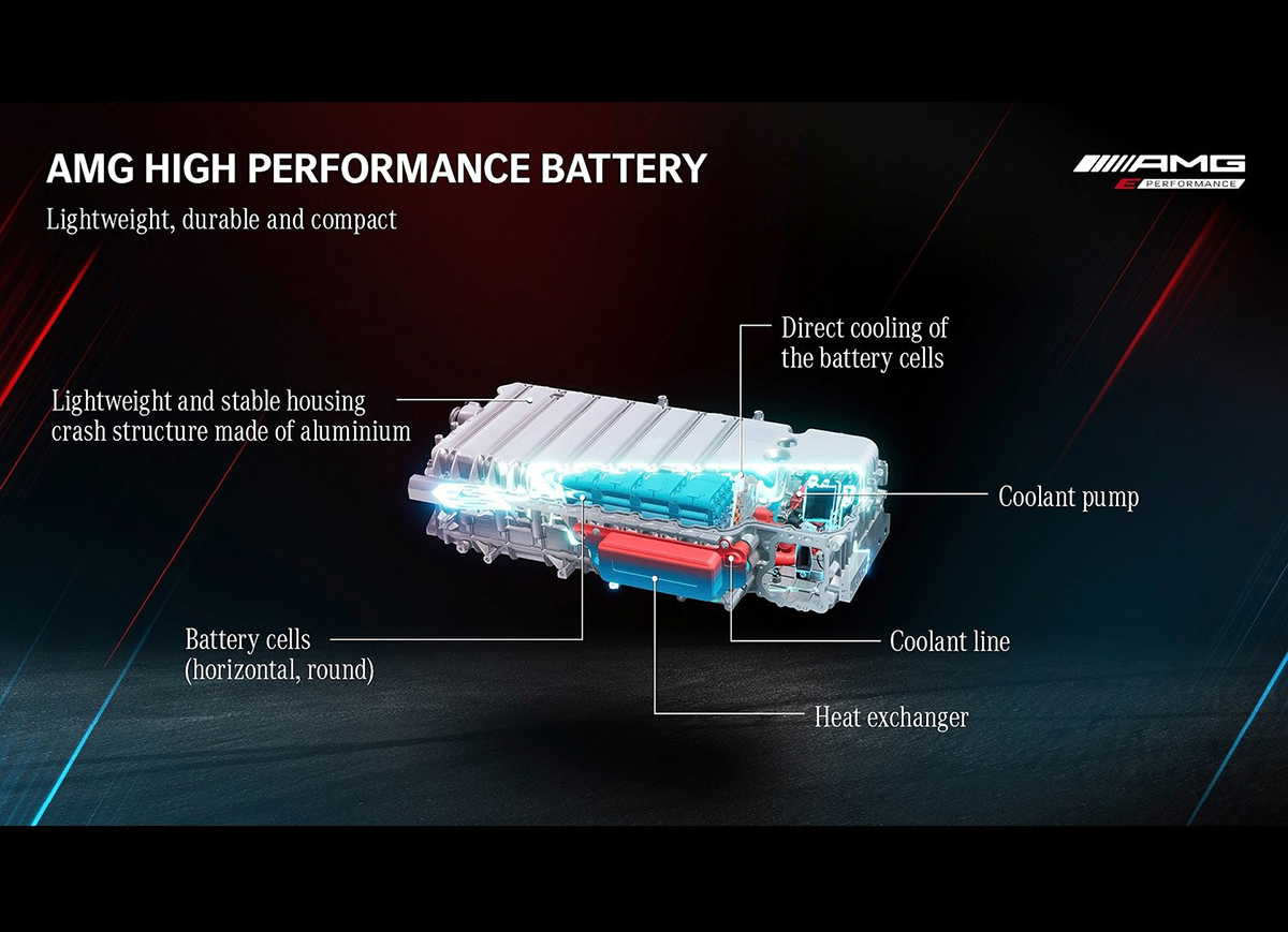 400볼트 배터리는 AMG에서 자체적으로 개발했다. 이 배터리의 가장 큰 특징은 간접 냉각 방식이 아닌 직접 냉각(Direct cooling) 시스템을 사용한다는 것이다. 배터리 전용 냉각수가 560개에 이르는 배터리 셀 사이를 흐르며 개별적으로 냉각을 시켜주도록 했다. 온도가 너무 높거나 낮으면 제 성능을 발휘하지 못하기 때문이다. 현재 각 셀의 에너지 밀도가 갈수록 높아지고 있어 배터리의 온도 제어의 중요성도 높아지고 있다. 기존의 공기나 냉각수를 활용해 간접적으로 냉각하는 방식으로는 금방 한계에 도달할 수밖에 없다. 이에 배터리 셀 자체를 개별적으로 냉각시켜줄 수 있는 방식을 고안한 것.