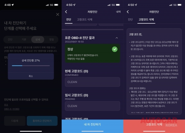 블루투스도 연결되고 자동차 등록이 끝나면 본격적인 메뉴를 사용할 수 있다. 다른 것보다 가장 먼저 해야 할 일은 진단이다. 진단 메뉴가 간단, 기본, 상세, 정밀로 나뉜다. 메뉴에 따라 진단 시간에 차이가 있으며, 오류코드가 발생하면 바로 검색해 이상 징후가 있는 부분을 확인할 수 있다. 일부 오류 코드는 앱에서 지울 수 있지만 완벽하게 지워지지 않는 경우도 있다. 이때는 전용 진단기를 갖춘 공식 서비스센터를 찾아 점검받는 것이 좋다. 진단을 실행했을 때 이상 없이 나오면 바로 다른 메뉴들을 확인할 수 있다.
