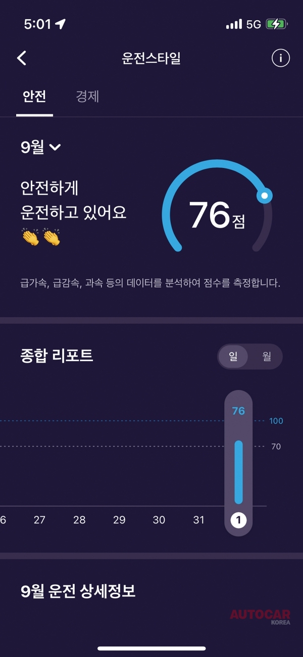 이 메뉴에는 운전자의 운전습관을 토대로 점수가 표시된다. 점수가 높을수록 좋은 것은 당연하고 안전, 경제 두 가지 메뉴가 제공된다. 무엇보다 인포카는 빅 데이터를 바탕으로 운전자의 경제적인 운전을 돕는 기능이 있다. 이런 기능만 잘 활용해도 연료비나 소모품 비용을 절약할 수 있다.