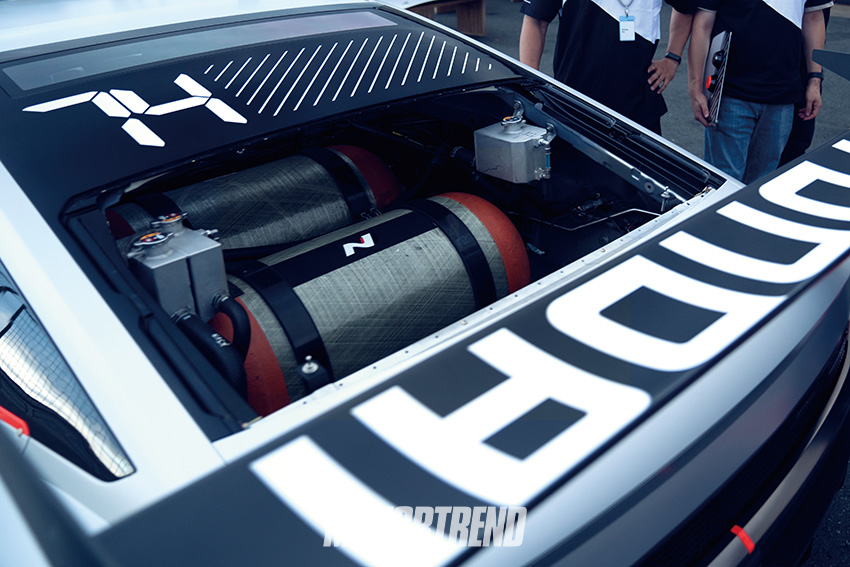 또 공기역학 성능을 위한 프런트 스플리터, 리어 디퓨저 등을 올려 강력한 성능을 눈으로도 짐작할 수 있게 했다. 그러나 무엇보다 N 비전 74가 특별한 이유는 수소 전기 하이브리드 모델이라는 사실! 기존 수소연료전지 자동차가 일체형 수소연료전지 스택과 모터를 사용한 것과 달리 N 비전 74는 이 둘을 분리했다.