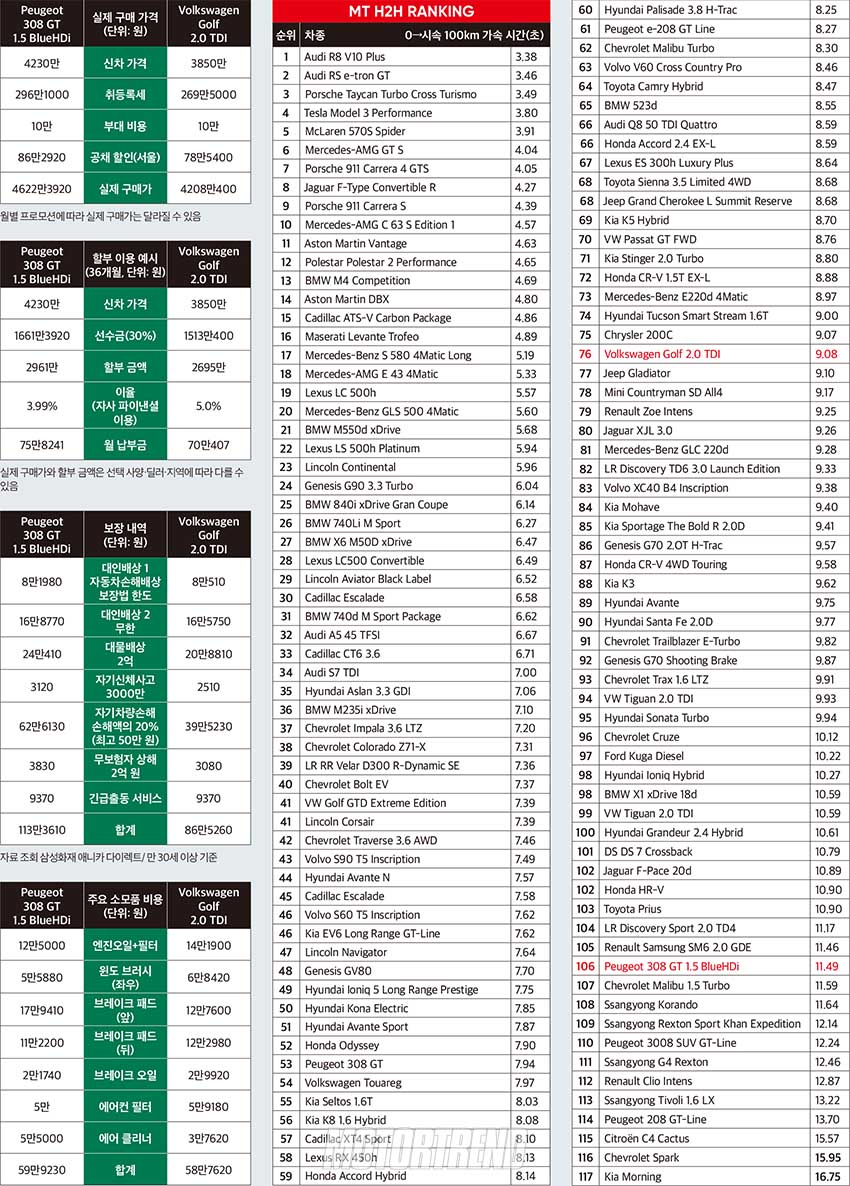 그런데 두 모델 모두 출발 시에는 아쉬운 점이 있었다. 308은 작은 엔진과 8단 변속기를 사용하는데도 의외로 발진 응답성이 부족했다. 시속 20km까지 가속하는 데 1.8초 수준의 느린 기록을 보였다. 골프는 듀얼클러치 변속기를 사용했음에도 시속 20km 가속에 1.4초 정도로 나쁘지 않은 기록을 보였다.