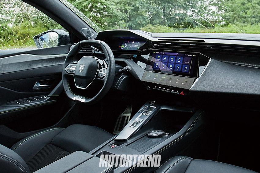 이에 비해 308의 운전석은 첫눈에도 엄청 화려하다. 작은 스티어링 휠 위로 디지털 계기반을 바라보는 i 콕핏을 중심으로 한 운전석 레이아웃은 여전히 신선하다. 사실 따지고 보면 골프와 비슷한 부분이 많다. 디지털 계기반과 인포테인먼트 디스플레이의 위치와 대시보드를 가로지르는 송풍구 디자인은 물론 작은 셀렉터 레버를 중심으로 심플한 센터콘솔 디자인도 그렇다.