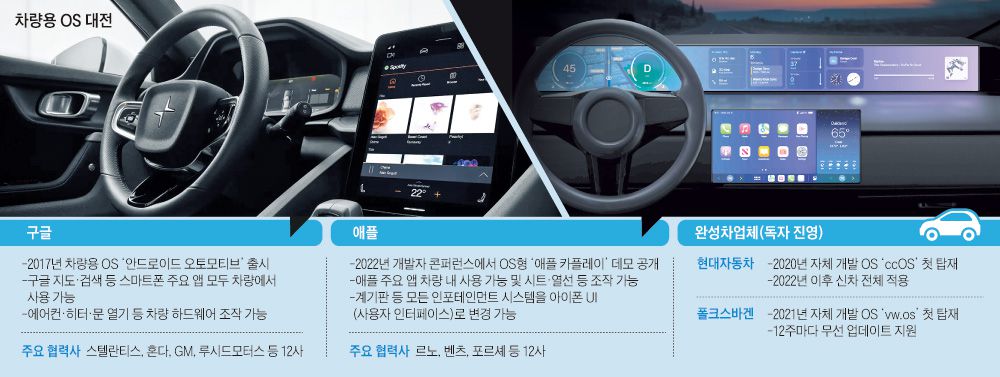 자동차 두뇌 역할을 하는 소프트웨어 OS(운영체제)에서 구글과 애플이 다시 전쟁을 벌일 것이란 전망이 나오고 있다. 완성차 업체들은 자체 OS를 개발하는 진영과 외부 업체의 OS를 쓰는 진영으로 나뉘고 있는데, 돈과 시간이 부족한 다수 완성차 업체들이 외부 OS를 쓰고 있기 때문이다. 월스트리트저널(WSJ)은 ‘애플과 구글의 다음 격전지는 ‘자동차의 영혼’(OS)에 해당하는 시장’이라고 보도하기도 했다.