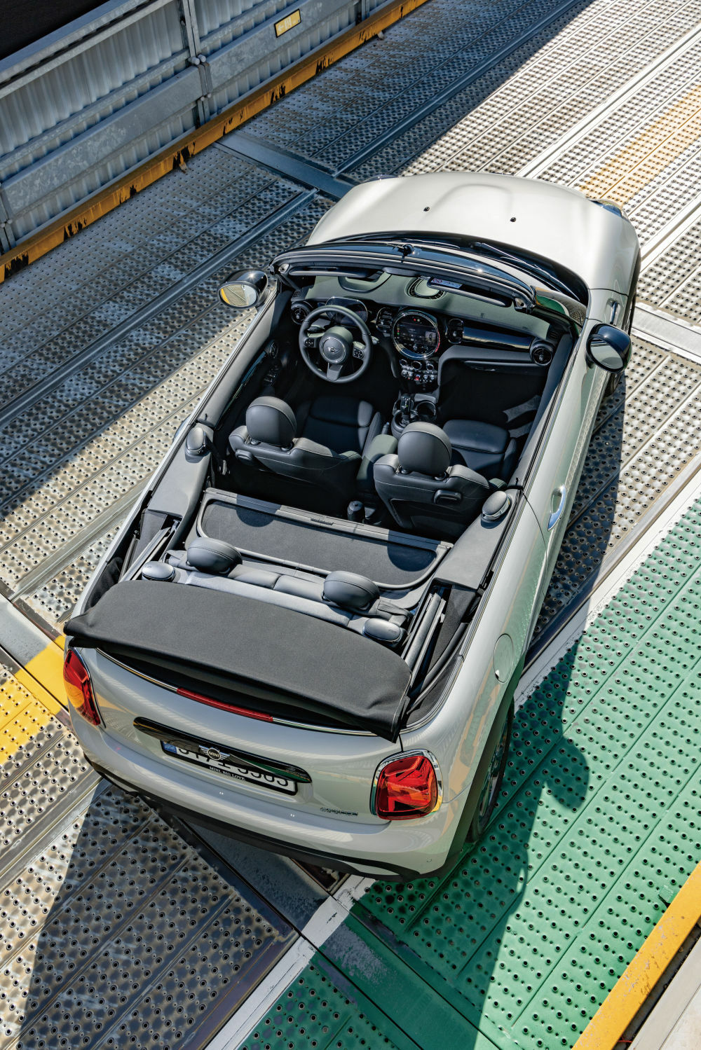 미니 컨버터블에 소프트톱은 해치백의 날렵한 디자인과 달리 C 필러가 패브릭으로 두껍게 마무리된다. 그래서 톱을 닫고 있을 때는 해치백보다 답답해 보이는 모습이다. 반면 톱을 열면 분위기가 완전히 달라진다. 루프가 트렁크 위로 접히며 매끈한 보디라인 뒤로 합세하고, 컴팩트 한 차체와 어울려 마치 로드스터처럼 가볍게 변신한다. 전동식 소프트 톱을 작동하는데 걸리는 시간은 약 18초. 버튼 하나로 작동하는 전동소프트 톱은 시속 30km 이하로 주행 중일 때도 마음대로 여닫을 수 있어서 원하는 순간 곧바로 하늘을 마주할 수 있다. 똑똑한 루프는 오픈 톱의 기능 외에도 앞부분이 Z 폴딩 방식으로 3단계 작동해서 평소엔 선루프로 활용도 가능하다.