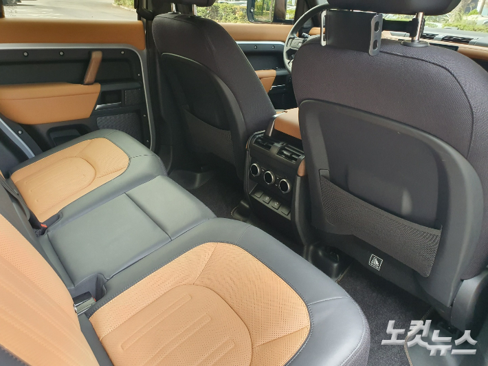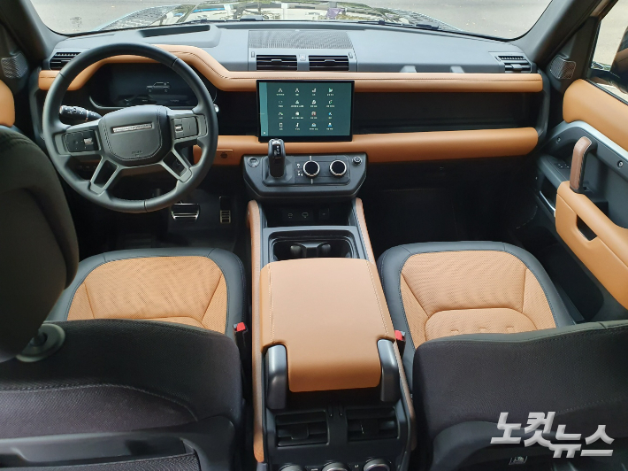 디펜더 110 P400X는 지붕과 엔진 덮개인 보닛 부분 등에 '나빅 블랙' 색을 입혀 강인한 이미지를 표현했다. 높은 차체와 각진 디자인만으로도 위압감을 주는데 여기에 포인트 색상을 넣어 더욱 부각한 것이다.