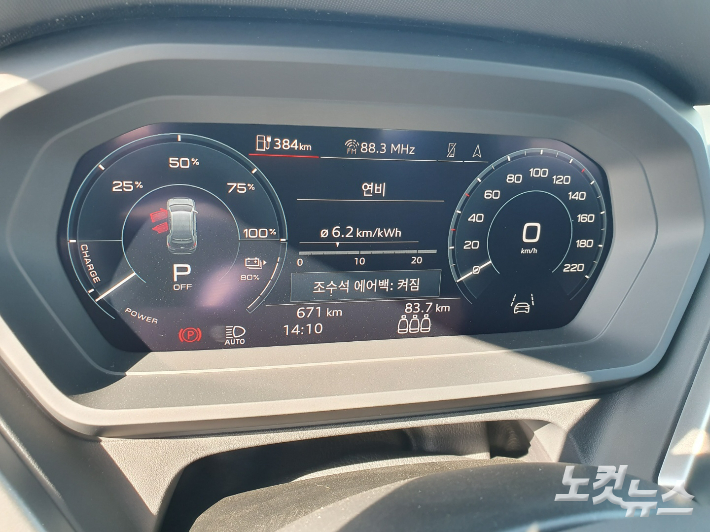 수치상으로는 부족하다고 생각할 수 있지만, 이날 실제 주행을 해보니 6km/kWH 내외로 측정값이 알려진 것보다는 훨씬 넉넉하게 나왔다. 1100고지 휴게소에 오를 때도 5.3km/kWH로 나타났다. 아우디코리아 측 설명으로는 이번 시승 코스에서 7km/kWH 안팎까지 나왔다고 한다.