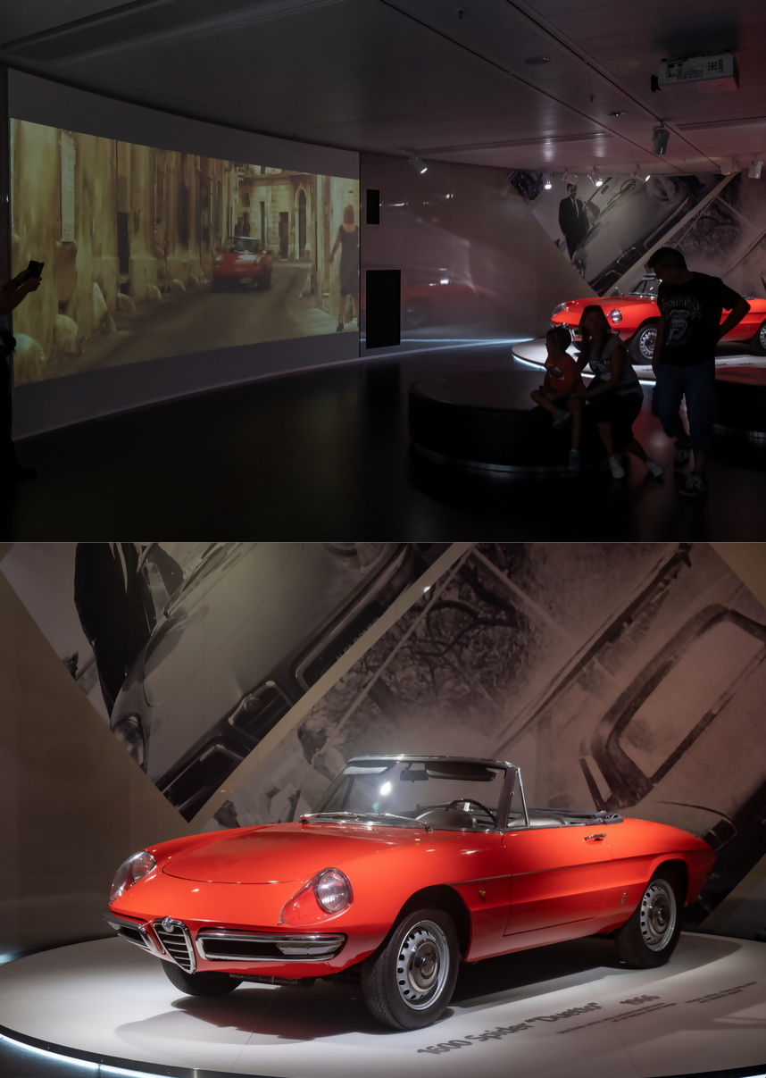 같은 층에는 작은 상영관도 마련돼 있습니다. 여러 영화 등에 등장한 알파 로메오를 보여주는 그런 영상 자료실인데 상당히 잘 꾸며져 있습니다. 화면 옆에는 1955년형 줄리에타 스파이더 프로토티포, 또 1966년 제네바모터쇼를 통해 데뷔한 1600 스파이더 듀에토(Deutto) 등이 전시돼 있는데, 화면 속 자동차가 바로 옆에 실제로 전시돼 있으니 묘한 기분까지 들었습니다.