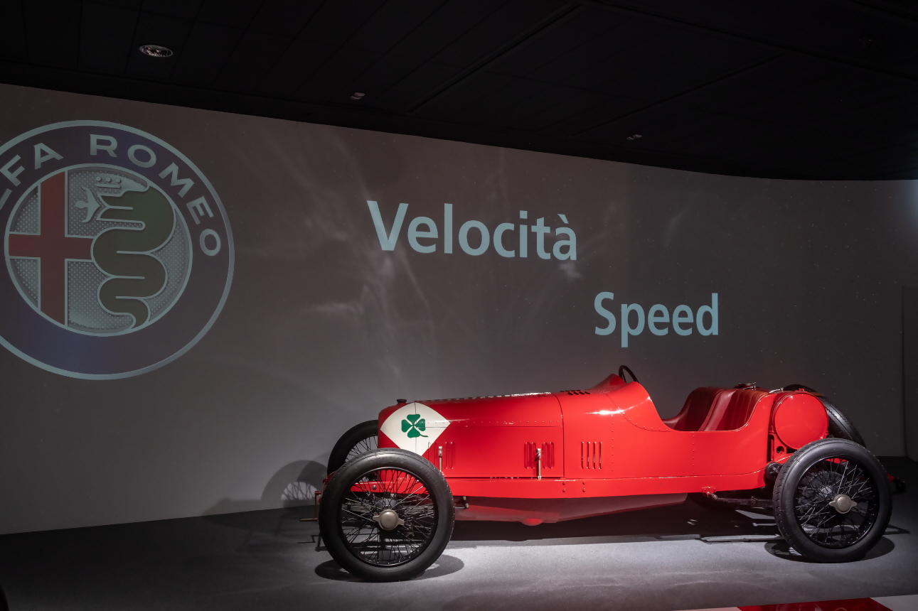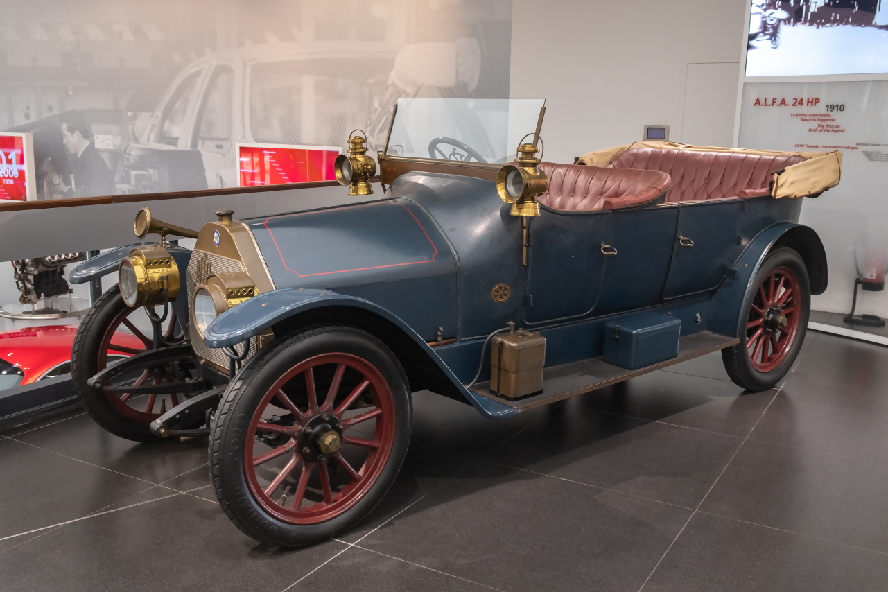 에스컬레이터를 타고 6층쯤 되는 전시실로 맨 위로 올라가면 알파 로메오 역사의 첫 페이지가 열립니다. 이곳엔 시대별로 브랜드를 대표하는 모델들이 전시돼 있는데 그중에서도 1910년에 나온 알파 로메오의 첫 번째 모델 A.L.F.A 24 HP가 방문객들을 가장 먼저 맞이합니다.