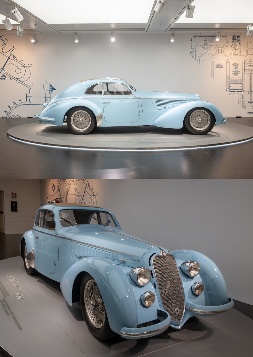 알파 로메오의 아름다운 디자인 역사는 계속됩니다. 콘셉트카 전시 공간을 벗어나면 실제로 판매되었던 멋진 양산형 모델들이 기다리고 있습니다. 이 테마 공간에 전시된 모델 중 단연 최고는 1938년 모델인 8C 2900 B Lungo입니다.
