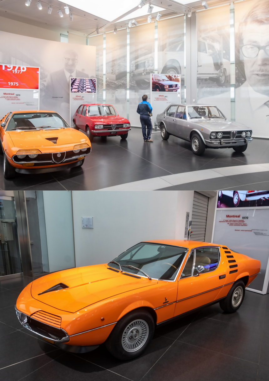 1950년대까지 알파 로메오를 빛낸 모델들을 뒤로하고 다음 공간으로 가면 오렌지 색상의 몬트리올 한 대가 유독 눈에 들어옵니다. 이 스포츠 쿠페는 알루미늄 V8 엔진이 적용되었는데 1970년 제네바모터쇼에서 처음 공개가 되었습니다. 그렇다면 왜 몬트리올이라는 지명이 들어갔을까요? 1967년 캐나다 몬트리올에서 열린 세계박람회에 콘셉트카를 내놓는데 이것이 양산으로 이어졌기 때문이라고 합니다.