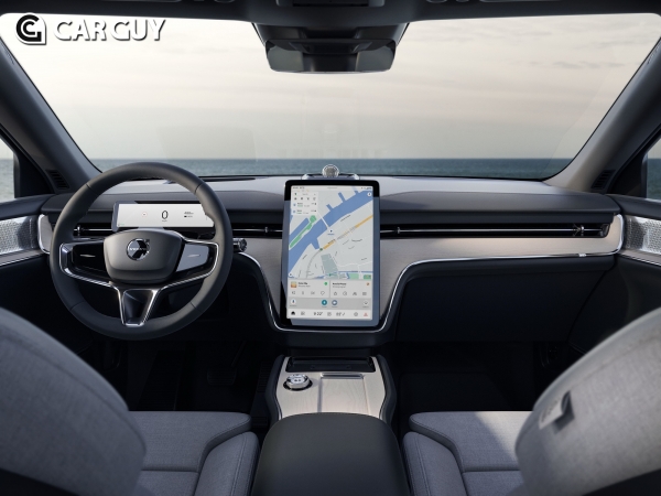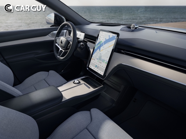 디스플레이는 구글 안드로이드 오토모티브 OS가 들어갔다. 폴스타2에 적용된 것과 같은 운영체제다. 볼륨 다이얼은 센터 콘솔 좌측에 붙어있다. 우측에는 커버가 있는 컵홀더, 앞쪽에는 휴대폰을 놓을 수 있는 얕은 공간이 있다. 콘솔 하단에도 넓은 사이즈의 수납공간 덕에 큰 부피의 짐을 넣을 수 있다. 비상등 조작도 디스플레이 안쪽에 터치로 작동한다. 미니멀리즘을 추구하는 테슬라 모델3도 대부분의 버튼을 디스플레이에 통합했지만 비상등 버튼만 남겨뒀다.