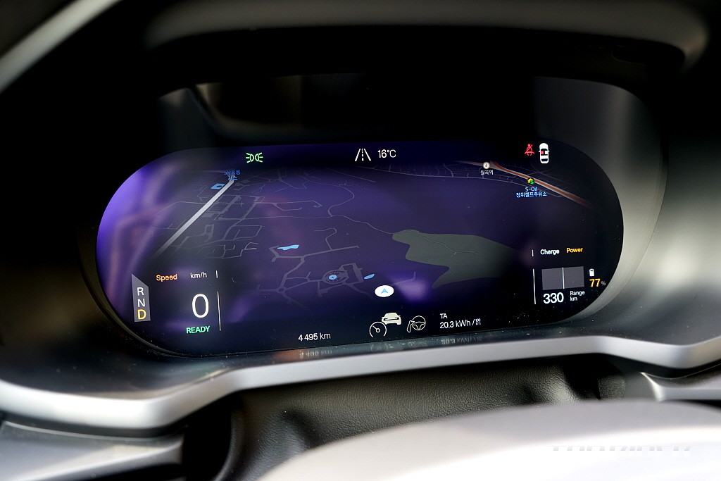 고성능 듀얼모터 전기차 중에서는 평범한 주행거리 334km 인증을 받았는데, 차량 수령시 77% 배터리 용량으로 잔여 주행거리 330km를 나타낸다. 90%까지 충전 후 실제 주행에서 400km 주행은 어렵지 않았다. 외부 기온 12도, 고속주행 80%를 고려해도 좋은 편이다.