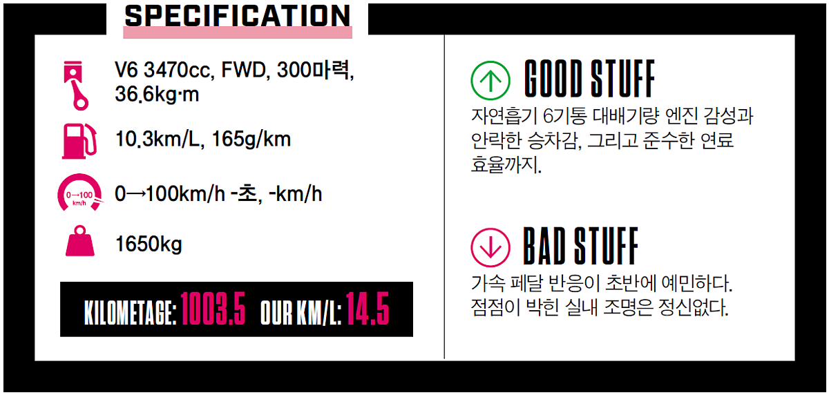 다행히 남쪽에 다다를수록 숨통이 점차 트였다. 뻥 뚫린 도로와 V6 엔진. 기대하고 기대하던 가속력 검증 시간이다. 가속 페달을 끝까지 밟자, 부리나케 8단 변속기가 저단 기어를 물며 rpm(엔진회전수)을 끌어 올린다. 가속이 처음엔 뜨뜻미지근하더니 이내 화끈하게 솟는다. 기분이 다 상쾌하다. V6 엔진이 속 시원한 소리를 퍼뜨리며 고회전으로 치달으면, 태코미터 바늘과 함께 토크가 폭발하듯 끓어오른다. 6500rpm 부근에서 싹둑 기어를 바꿔 무는 변속기가 원망스러울 지경. 엔진회전수가 오르면 도리어 토크는 고꾸라지는 터보가 판치는 요즘 시대에 느끼기 힘든 대배기량 자연흡기 맛이다.