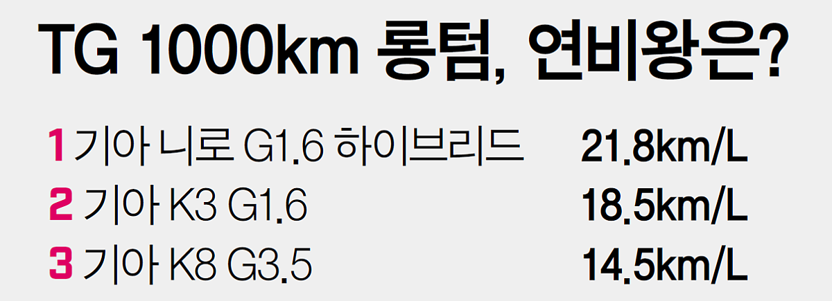 덕분에 쉬지 않고 서울까지 달려 1000km 여정을 마무리 지었다. 대망의 연료 효율은? 21시간 21분 동안 누적 1003.5km 달리면서 1L에 14.5km를 기록했다. 대부분 느긋하게 달리긴 했으나, 가끔 급가속하고 정체 도로를 적잖이 통과했는데도 연비가 꽤나 높다. ‘풀투풀’ 주유 결과도 비슷하다. 중간 주유와 최종 주유를 합쳐 모두 70.66L 들어갔다. 주유량으로 계산한 연비는 14.2km/L. 훌륭하다.
